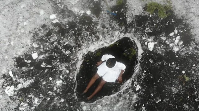 I dug back a layer of snow to reveal a little of the flank of mother Etna beneath, over 2000 metres above sea level. Etna is an active volcano in Sicily, standing at over 3,300 metres. The work is about practising intimacy with nature; being held. Sweeping away crusts. Finding warmth in impossible landscapes, yearning ‘skin’, low, silent subterranean breathing. I embed myself in Etna (now cold, but still here) after seeing her in the distance every day and sharing Catania as a home, with her.